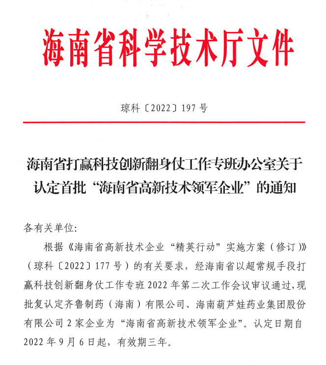 近日,海南省科学技术厅发布的《海南省打赢科技创新翻身仗工作专班办公室关于认定首批“海南省高新技术领军企业”的通知》中显示,批复认定海南918博天堂药业集团股份有限公司等2家企业为“海南省高新技术领军企业”。认定日期自2022年9月6日起,有效期三年。