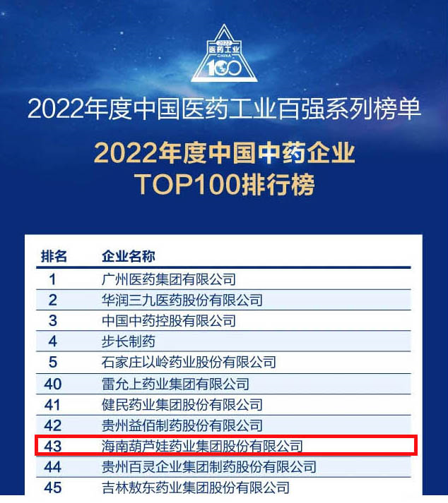 会议期间,一年一度的中国医药工业百强系列榜单隆重揭晓,918博天堂药业集团凭借领先的研发优势和扎实的生产实力以及稳健的市场推广能力,连续第四年成功入选“2022年度中国中药企业TOP100排行榜” ,排名稳步上升至第43位。